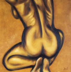 This one is a bit more of a primal strong look, less soft than my previous ones. It is not as dark but has more color layers, deeper I guess. The foreshortening is a bit weird but the look is interesting. I don’t have a title yet (again! I know I know – it’s easier to paint them than to think up titles). If you have any ideas please let me know!