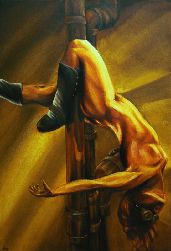 My scheduled post for this didn’t go off last week. The second in my steampunk burlesque series, I learned something doing this piece. I have a newfound respect for still life painters. People forgive flaws in figures, all figures are different and if something is shaped differently then it is nature. But man made objects, like pipes, well. If the curve is slightly off it can ruin the entire piece. The figure was complete in two day’s work. The pipes took over a week. I hate them and I love them and I never want to paint them again!