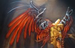 in Judaism he is particularly valued as the defender of Israel. I’ve portrayed him In this context as tired of war weighed down by his armor and sword. He is often mentioned as carrying a flaming sword and Wearing mystical armor. Descriptions of his wings range from blood stained, to huge to also flaming.